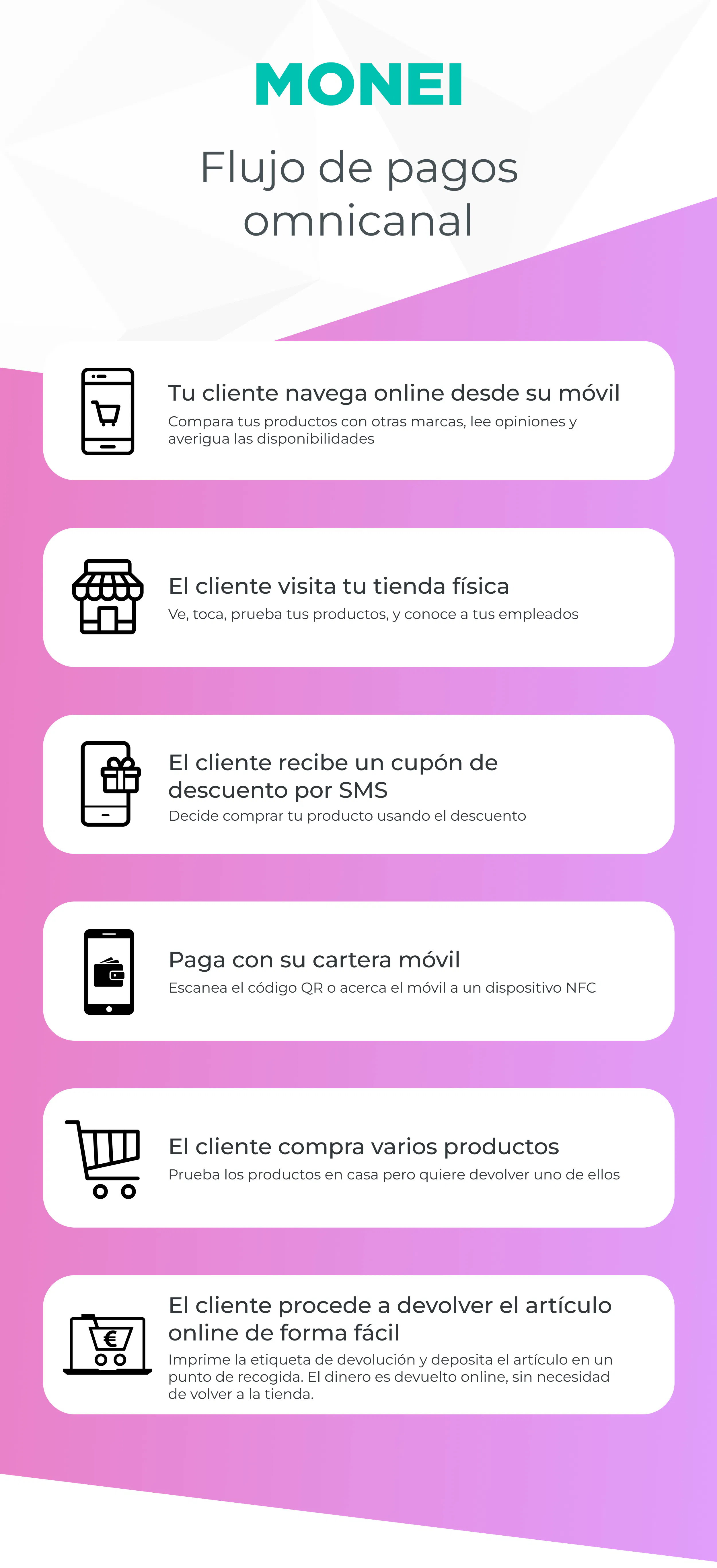No. Las soluciones modernas de pago omnicanal, como MONEI Pay, no requieren costosos sistemas de punto de venta ni una infraestructura compleja. Puedes aceptar pagos directamente desde tu smartphone u otros dispositivos utilizando códigos QR o dispositivos con tecnología NFC. Esto hace que sea más fácil y asequible para empresas de todos los tamaños empezar a utilizarlas, tanto si vendes online, en tienda o sobre la marcha.